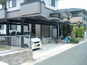 U.スタイル(カーポート)です。3セットの屋根セットの組合せです。雨が降っている時でも濡れずに玄関までたどり着きます。