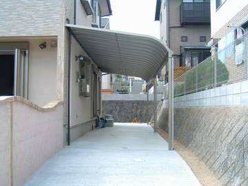 物干し屋根と車庫屋根兼用のR型テラスです。熱線遮断FRP板仕様です。