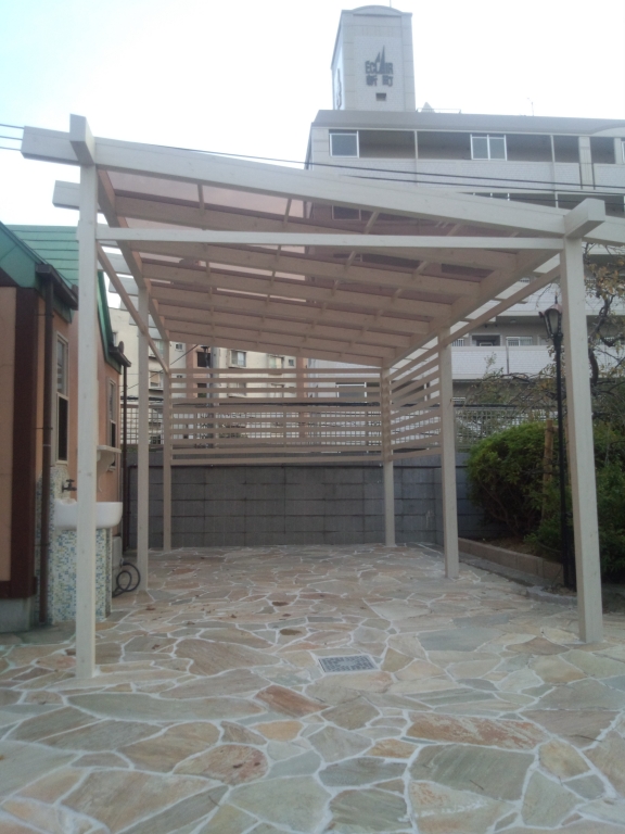 タカショーのEUポーチガーデンをカーポートとして使いました。 ホワイトパインのカラーリングが、とてもおしゃれです。