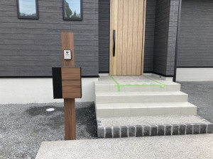 表札、表札灯、インターホン、ポストを備えた門柱タイプの機能ポールは 素敵な住宅をさらに引き立てます☆ 樹形がきれいなシマトネリコの植栽で、華やかな空間になりました♪