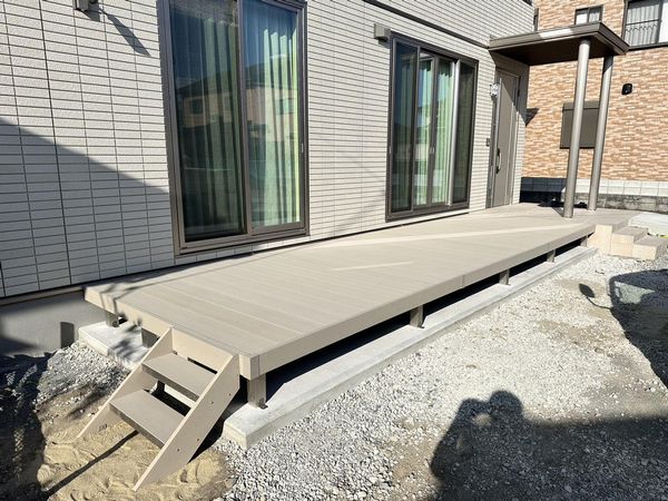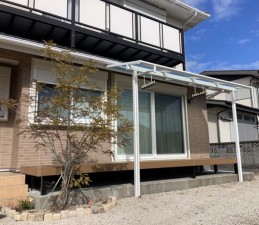 素敵な家屋に合う色合いのデッキとテラスになりました。 テラスはスッキリとしたデザインが特長です。 【ウッドデッキ:三協アルミ ひとと木、テラス:三協アルミ レボリューA】