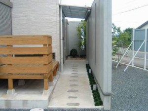 U.スタイル(カーポート)です。3セットの屋根セットの組合せです。雨が降っている時でも濡れずに玄関までたどり着きます。