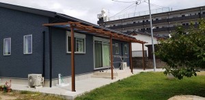 家屋に合う色あいのテラスになりました。 前面パネル付きで、道路や隣地からの視線をカットしたり、雨や風の吹き込みをやわらげるなど、テラスの使い勝手がよりアップします。 【三協アルミ レボリューA 前面パネル付き】