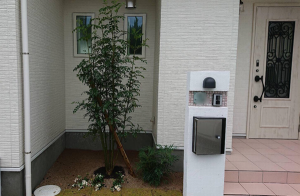 表札、表札灯、インターホン、ポストを備えた門柱タイプの機能ポールは 素敵な住宅をさらに引き立てます☆ 樹形がきれいなシマトネリコの植栽で、華やかな空間になりました♪
