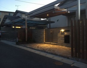 デザイン性の高い、色合いに統一感のある素敵な外構になりました。 門周りをダウンライトと表札灯で優しく照らし、植栽を照らすアッパーライトで夜のお庭の眺めも楽しめます。