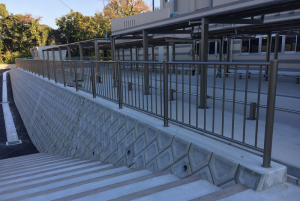 三協アルミのフェンス エルファードは見る角度によって視線を抑えて、ほどよく採光・通風します。 豊富なサイズバリエーションでパブリックスペースにも適しています。