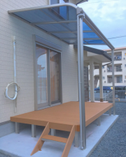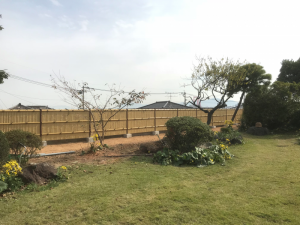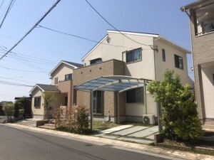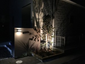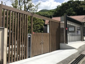 タカショーのエバースクリーンフレームに門扉、宅配ボックス付き機能門柱を組み込みました。その横には三和シャッターのサンゲートを付け豪華に上品に仕上がりました。また防犯対策もはばっちりです