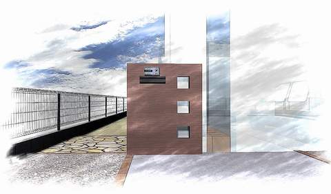 二世帯住宅のアプローチ部にアルミスリットによるR曲線目隠しをデザインしました。スリットの両端にはシンプルモダンイメージの機能門柱を設置しています。