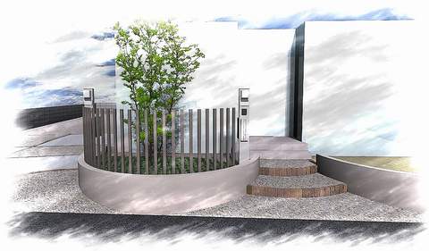 宅地の正面玄関口に、人用の門扉と車用の重連引戸を設けました。かなり、豪華なお庭の顔になりそうです。横には三角形の植栽スペースも。