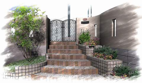 道路前面を全て車庫スペースとし、コンクリートの洗出し仕上と刷毛引き仕上、レンガ目地でアクセントを付けました。エントランスも鋳物門扉と塗壁仕上で華やかに演出されています。緑も重要な演出要素になっています。