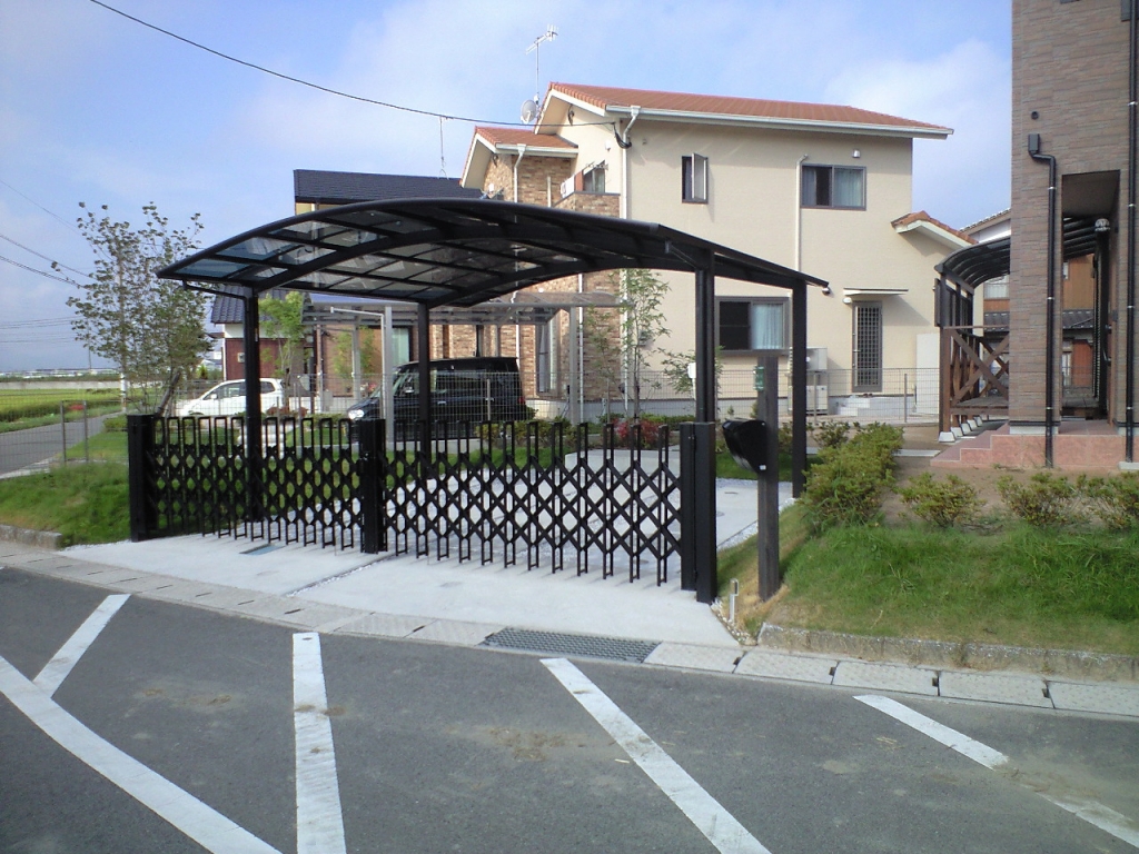 2台駐車用カーポートの前に土間の勾配に影響されないキャスター無しの伸縮門扉を取付しました。