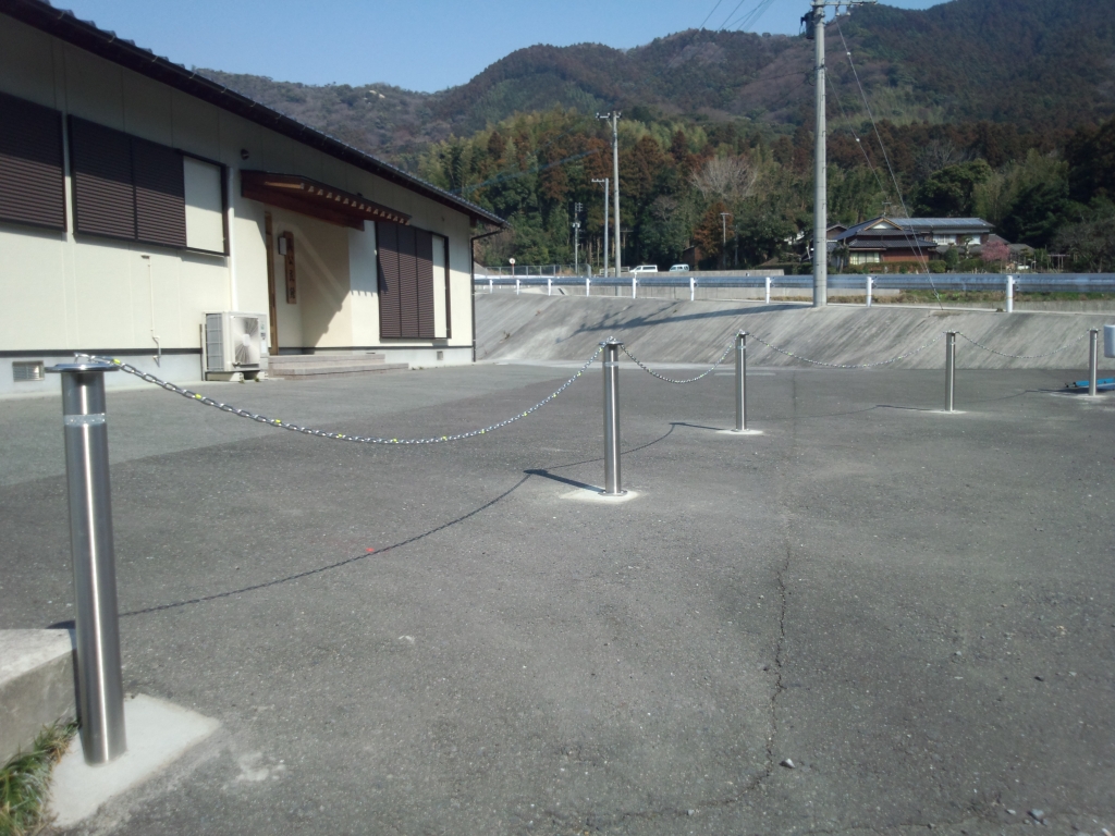 ステンレス製76.3φの車止めです。両側は、固定式で中間3本は、上下式タイプ です。