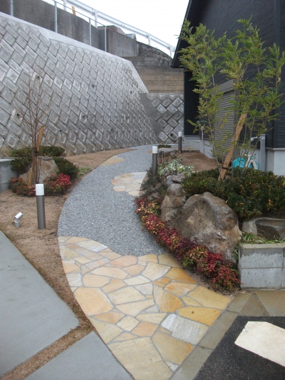(自然石張り仕上げ+コンクリート洗出し仕上によるスロープ) 段差の無いアプローチ形状とし、黄色系の自然石乱形石張りと両側の景石・樹木により、明るさの演出をおこないました。高低差に自然石を上手く使い、低木及び地被類で柔らかさを出しました。ポールタイプとスポットタイプの照明による『夜の景』の演出も良い感じです! FacebookXBlueskyHatenaCopy
