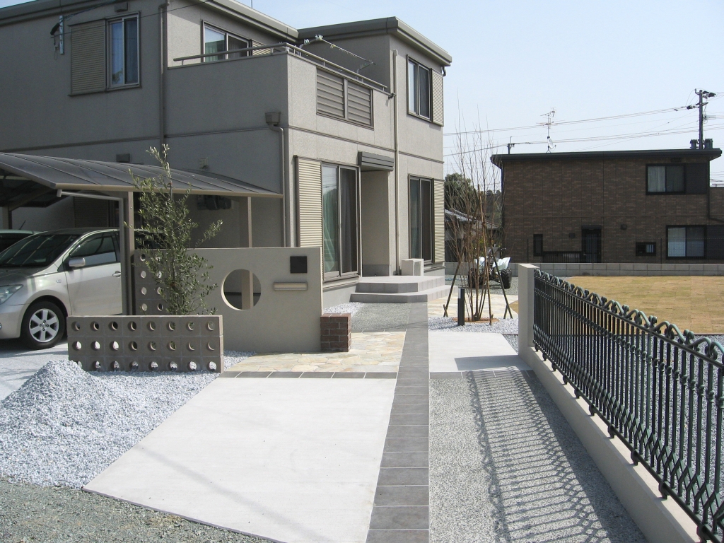 シンプルモダンデザインの建築に合わせて、使用材料もモノトーン系を中心に選択しました。塗壁門塀の○形スリットと前列のスルーブロック積が面白味を出し、玄関ポーチと芝張りの主庭へ続くタイルがアクセントになっています。 FacebookXBlueskyHatenaCopy