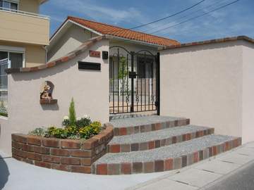 プロバンス風建築の明るいイメージを外構にも組み込みました。レンガ笠木+塗壁門塀と鋳物門扉の組み合わせにより、明るく楽しい雰囲気を表現しました。 門塀のスリットがかわいらしさのポイントになっています。
