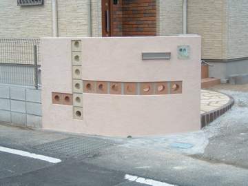 施主様が配色をとても気に入られております。スルーブロックは2色、表札はガラス製を使いました。玄関側からの見た目もなかなか良いです。