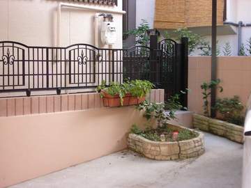 駐車場から続く勝手口です。花壇の形にも少しこだわって入り口を楽しく演出してみました。小さなスペースもあきらめずに工夫して緑を取り入れております