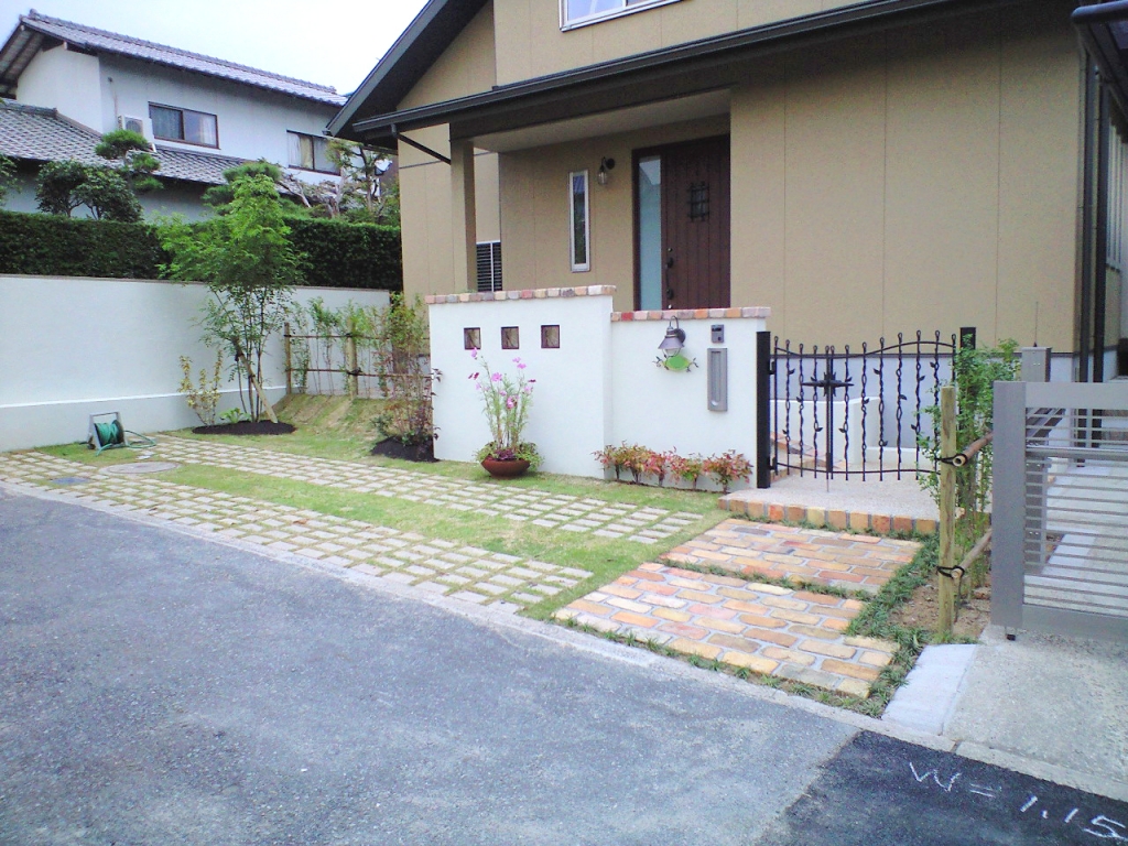 ”芝生” も工夫すると車庫として利用出来ます。工事最終日に ”コスモスの寄せ植え” を置きまし