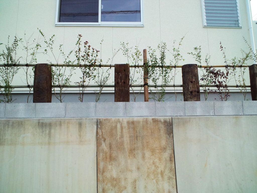 枕木をアクセントにした生垣です。生垣には4種類の樹木を使いました。