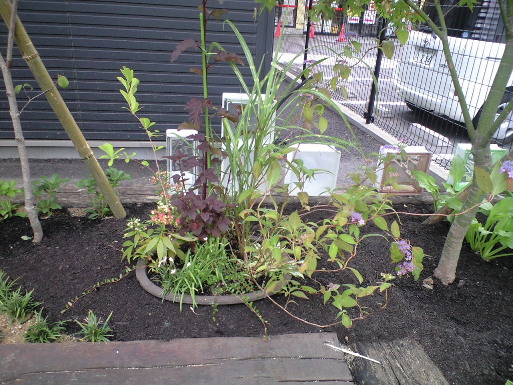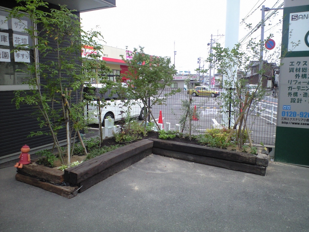 当社駐車場の片隅に、お客様との打合せ用に使える様な ”植栽スペース” を、枕木を使って作りまし