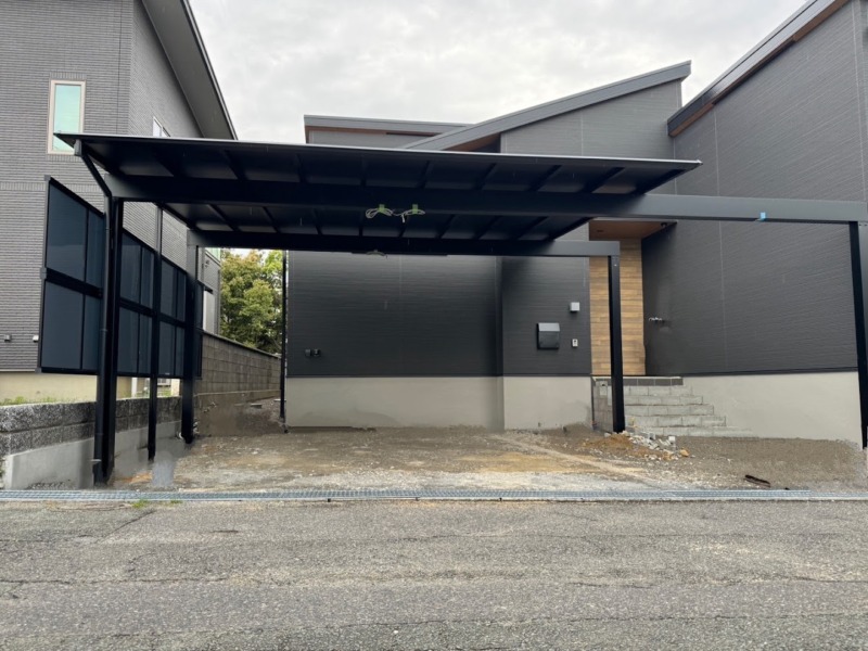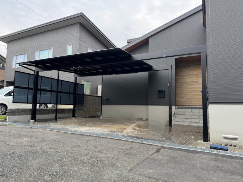 屋根のブラックポリカがモダンな家屋とあって一体感のあるスタイリッシュなカーポートになりました。