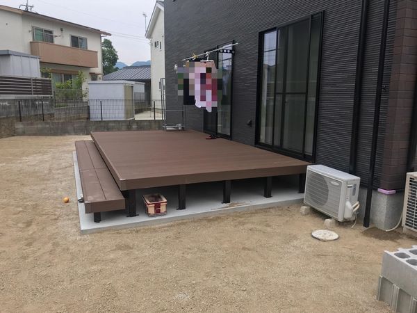 家屋からの移動が楽で快適さとくつろぎを感じれるウッドデッキが出来ました。 ステップを取りつけることによりお庭への上り下りが楽になります♪ YKKAPのリウッドデッキは木粉とプラスチックを主原料とし、耐久性に優れた素材を使用し、天然木特有の温かみを生かしたデッキです。 FacebookXBlueskyHatenaCopy