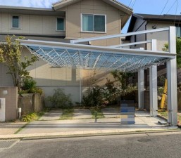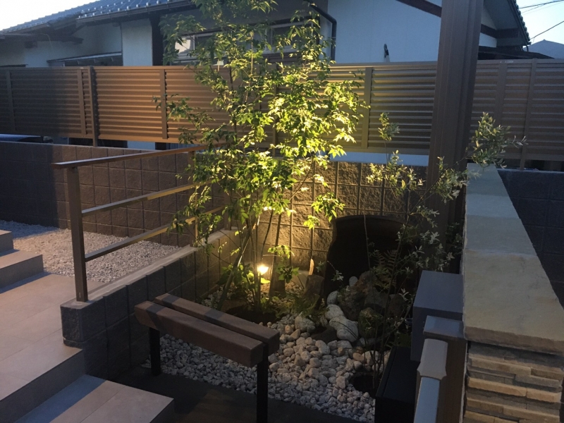 デザイン性の高い、色合いに統一感のある素敵な外構になりました。 門周りをダウンライトと表札灯で優しく照らし、植栽を照らすアッパーライトで夜のお庭の眺めも楽しめます。 FacebookXBlueskyHatenaCopy