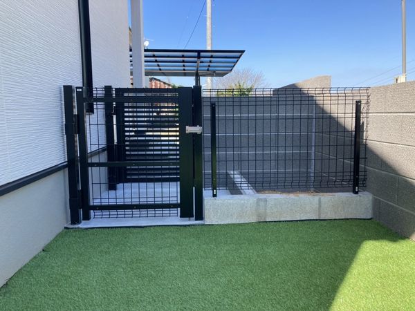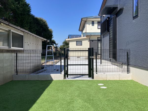 門扉は出入口をしっかりガード、フェンスは家屋に美しく調和しています。