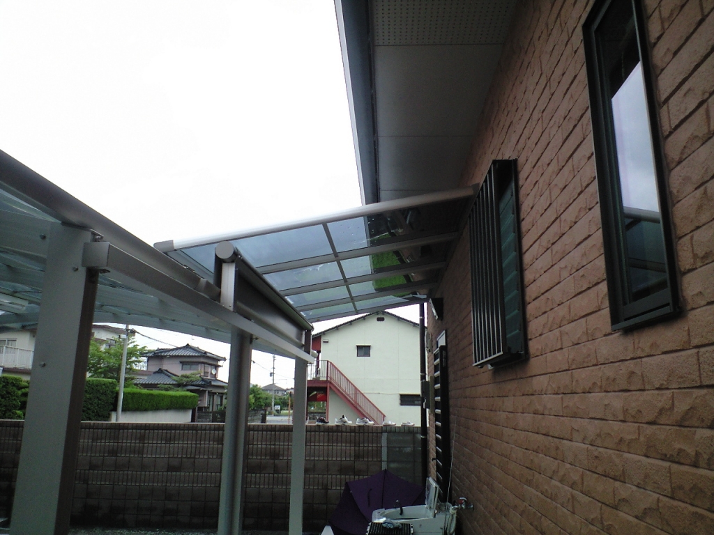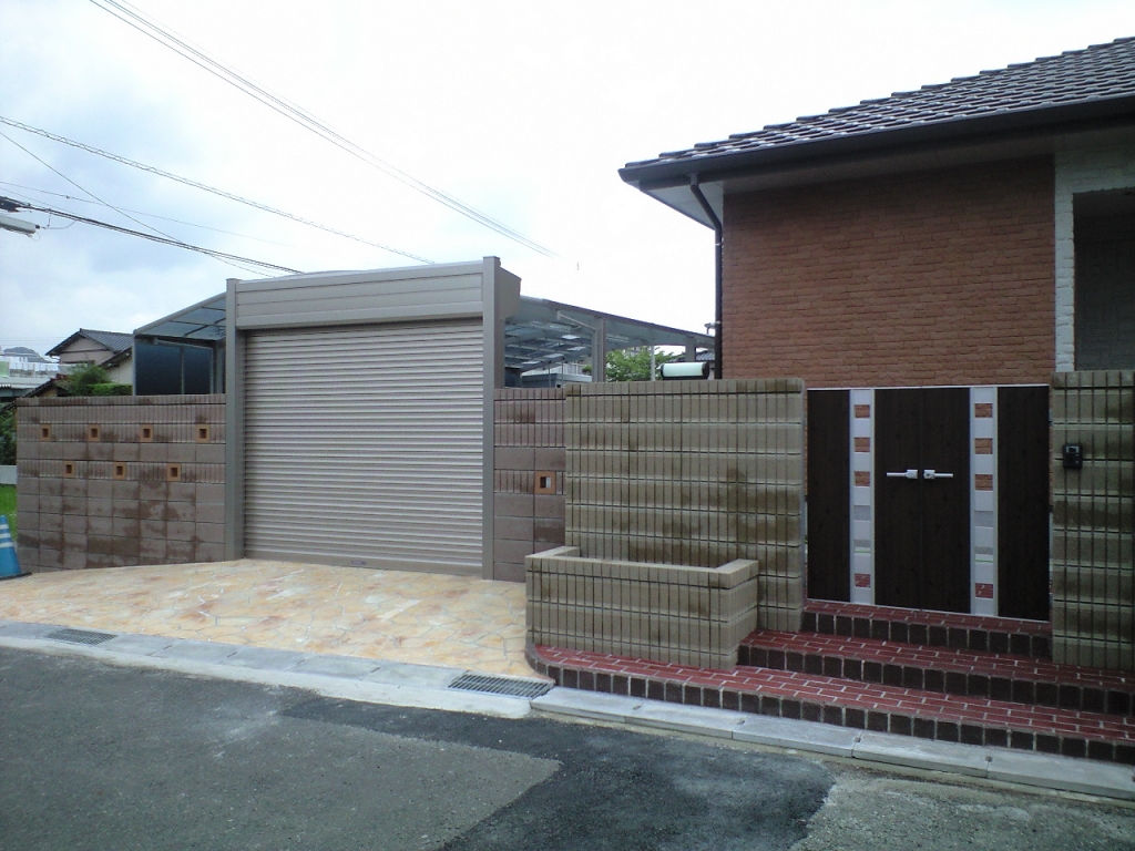 電動アルミスラットシャッターの ”サンゲートF型” を取付けました。 ”木調門扉” 下の階段アプローチ仕上には、”レンガ貼り調のグランドコンクリート”、サンゲート F型の前の土間仕上には ”乱形石貼り調のグランドコンクリート” を施工しています。 サンゲートF型の後ろには、 ”間口2列×奥行2列=計4台駐車用のカーポート” を取付しています。 現場対応の特殊納まりテラスです。 FacebookXBlueskyHatenaCopy